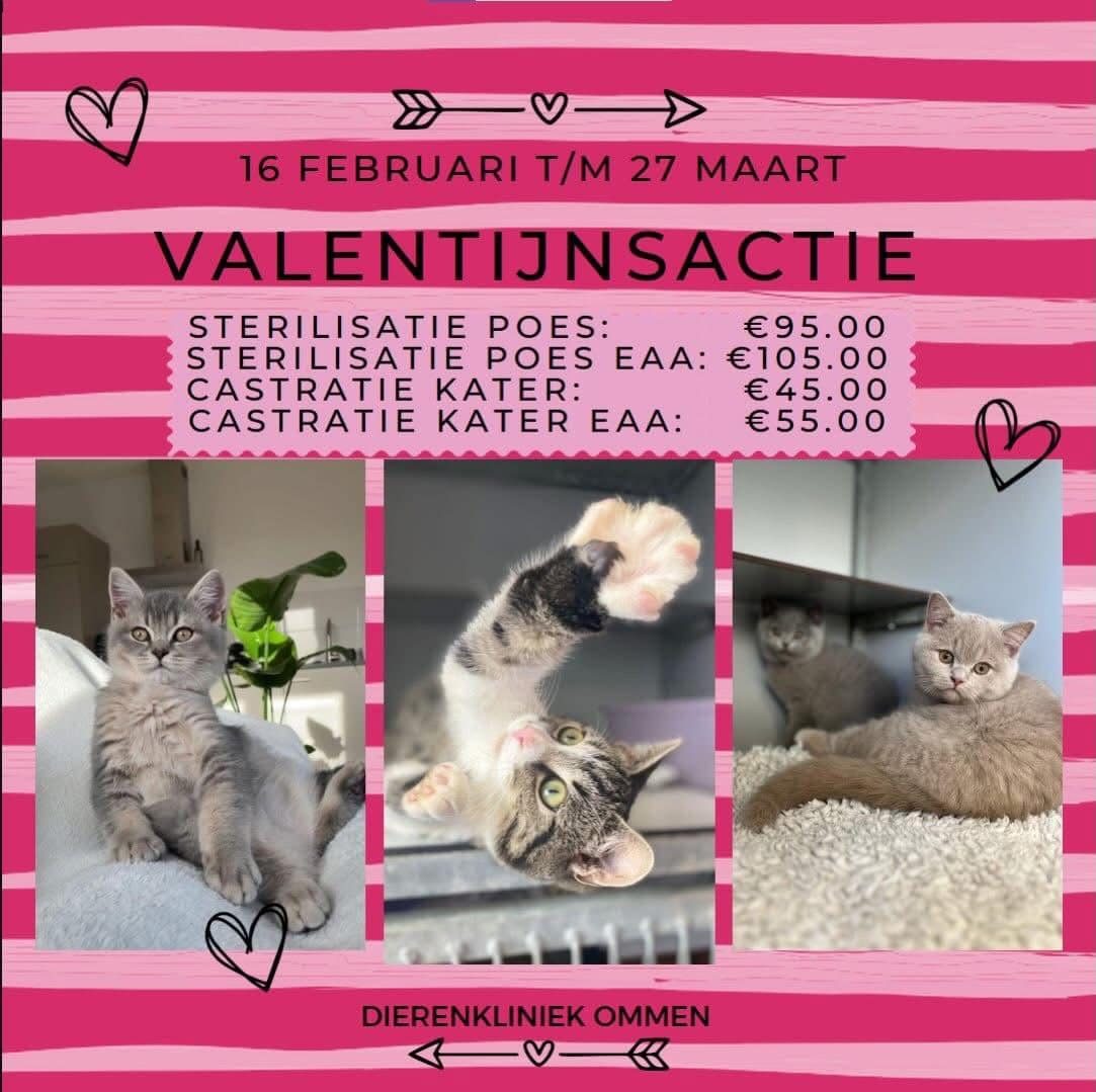 Ook dit jaar is het weer zover! De Valentijnsactie waarbij uw katten vanaf 4 maanden leeftijd tegen een aanzienlijke korting gesteriliseerd of gecastreerd kunnen worden.