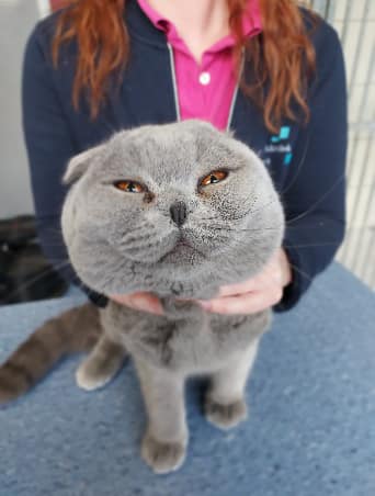 Een Scottisch Fold met een zeer brachycefale schedel. Deze kat werd ook voor BOS geopereerd