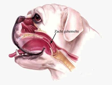 Het gehemelte (bestaande uit een hard deel en een zacht deel) vormt de afscheiding van de neusholte en de mondholte/keel. Een verlengd zacht gehemelte eindigt te ver naar achteren in de keel van de hond en valt hierdoor voor de ingang van het strottenhoofd. Hierdoor wordt de luchtstroom naar de longen belemmerd. Een verlengd zacht gehemelte geeft de typische snurkende ademhaling van deze honden.