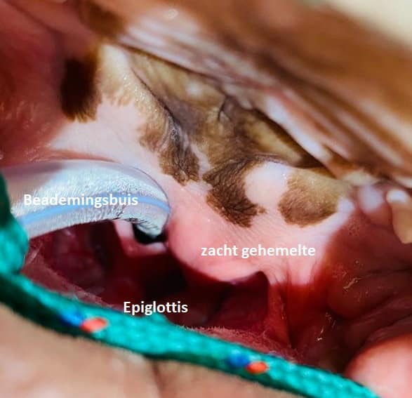 Deze hond is onder narcose en heeft een beademingsbuis in zijn luchtpijp. Het zachte gehemelte bij deze hond valt te ver achter de epiglottis. Dat is hier goed te zien doordat de beademingsbuis via de strottenklep (epiglottis) het zachte gehemelte omhoog drukt. Normaal gezien raken het zachte gehemelte en de epiglottis elkaar net met de puntjes aan.