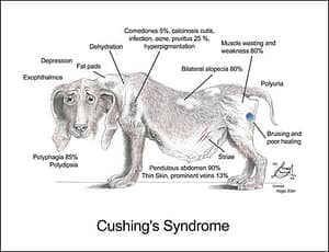 Bij middelbare / oudere honden komt nog wel eens de ‘ziekte van Cushing’ voor. Honden met het syndroom van Cushing drinken en plassen veel en hebben extreme honger. Ze hebben vaak een slechte vacht, een dunne huid en een hangbuik. Soms hijgen ze veel en ze hebben vaak spierzwakte.