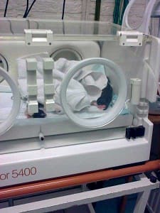 Dit is de couveuze, bij een keizersnede kunnen de net ter wereld gebrachte pups dan gelijk terecht in een lekkere warme ruimte die voorzien is van extra zuurstof.