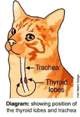 We kunnen natuurlijk al een vermoeden hebben als de kat een erg gezwollen schildklier heeft. Deze twee klieren zijn goed te betasten aan beide zijden van de luchtpijp.
