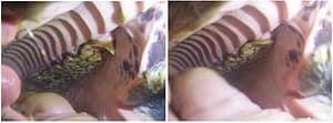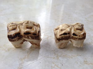 Links een haaktand waarvan het tandsteen verwijderd is, het tandvlees is gezwollen en ontstoken. Rechts een haaktand waar het tandsteen nog niet verwijderd is.