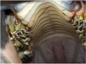 Niet alle wolfstandjes zijn zichtbaar. De zogenaamde blinde wolfstandjes zijn bedekt met tandvlees (te zien in het rode cirkeltje op onderstaande foto), maar daarom niet minder vervelend voor het paard.