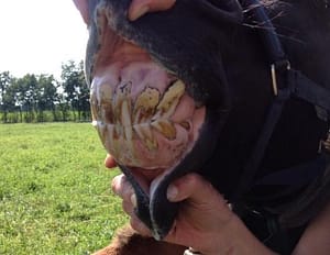 Een paard met EOTRH in een ver gevorderd stadium, er is veel tandsteen aanwezig op de snijtanden en de verdikte wortels zorgen voor een verdikt en bobbelig uitzicht van het slijmvlies, het slijmvlies ziet er ontstoken uit met meerdere kleine ulcers.