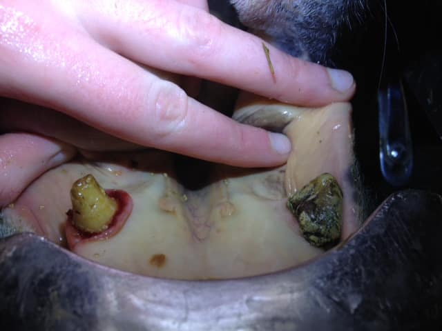 Een paard met EOTRH in een ver gevorderd stadium, er is veel tandsteen aanwezig op de snijtanden en de verdikte wortels zorgen voor een verdikt en bobbelig uitzicht van het slijmvlies, het slijmvlies ziet er ontstoken uit met meerdere kleine ulcers.