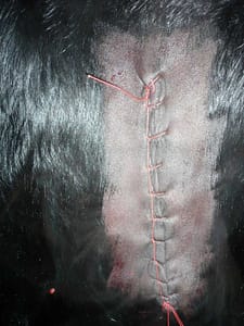 De chirurg controleert of er zich geen organen onder de hechting bevinden en sluit vervolgens de wond.