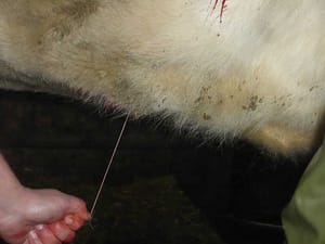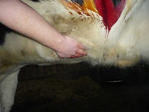 Onder lokale verdoving wordt bij het rechtstaande dier een snede van ongeveer 20 cm lang gemaakt in de linkerflank.